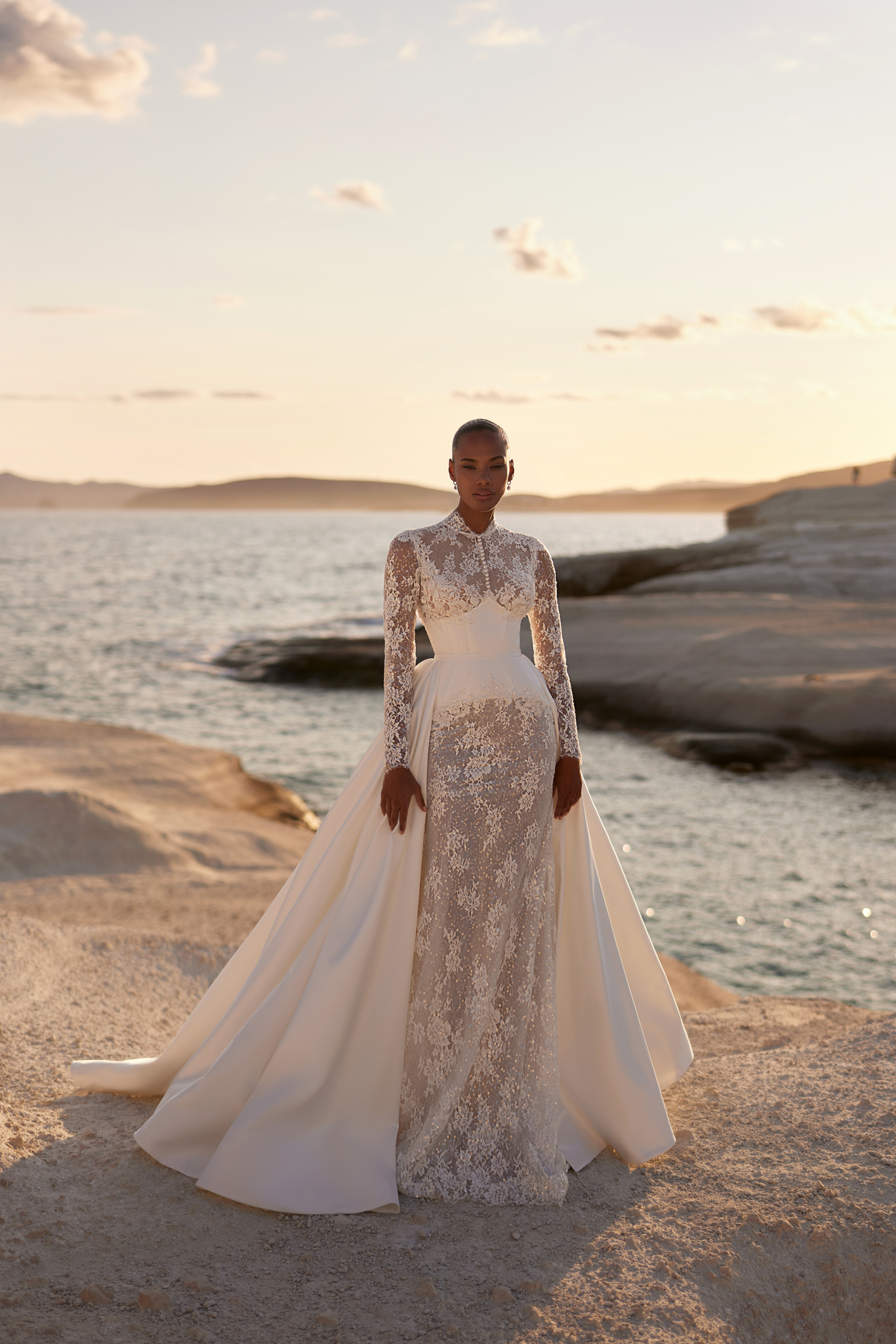 Drawing inspiration from the historic motifs of Greek mythology, where women embody wisdom, kindness, and inner resilience, this collection showcases delicately minimalistic silhouettes that are richly adorned with intricate embroidery and captivating details. Comprising 30 remarkable creations, the collection is meticulously crafted to empower the bride with confidence. An artful combination of diverse fabrics — floral lace, ethereal tulle, and diaphanous materials — creates a seamless interplay of texture and elegance.