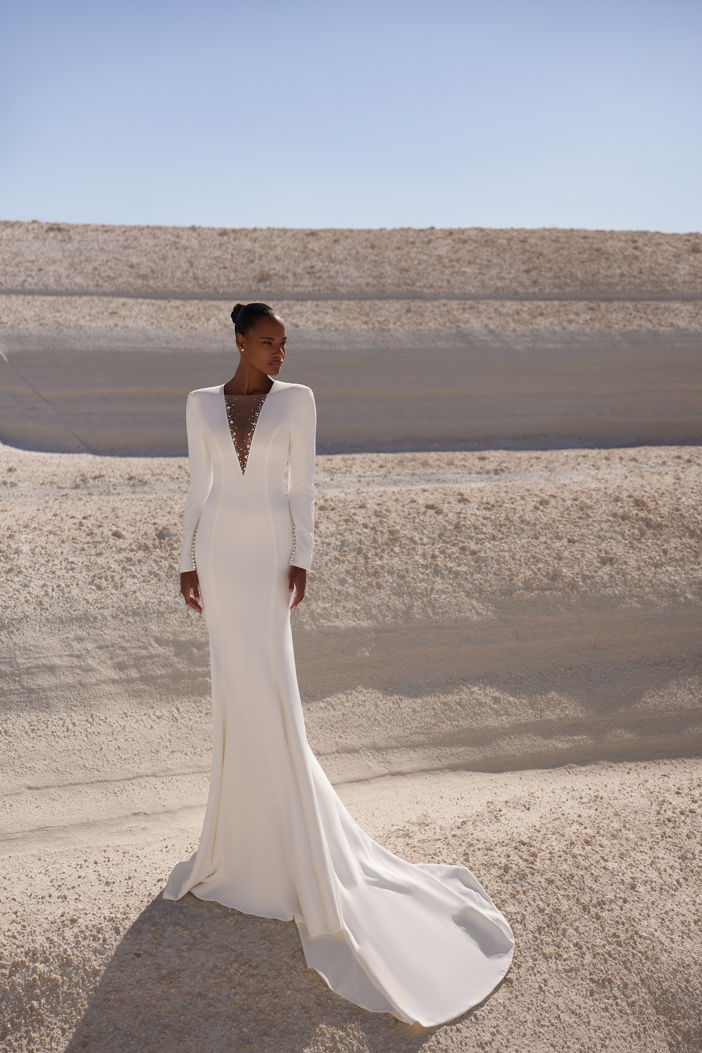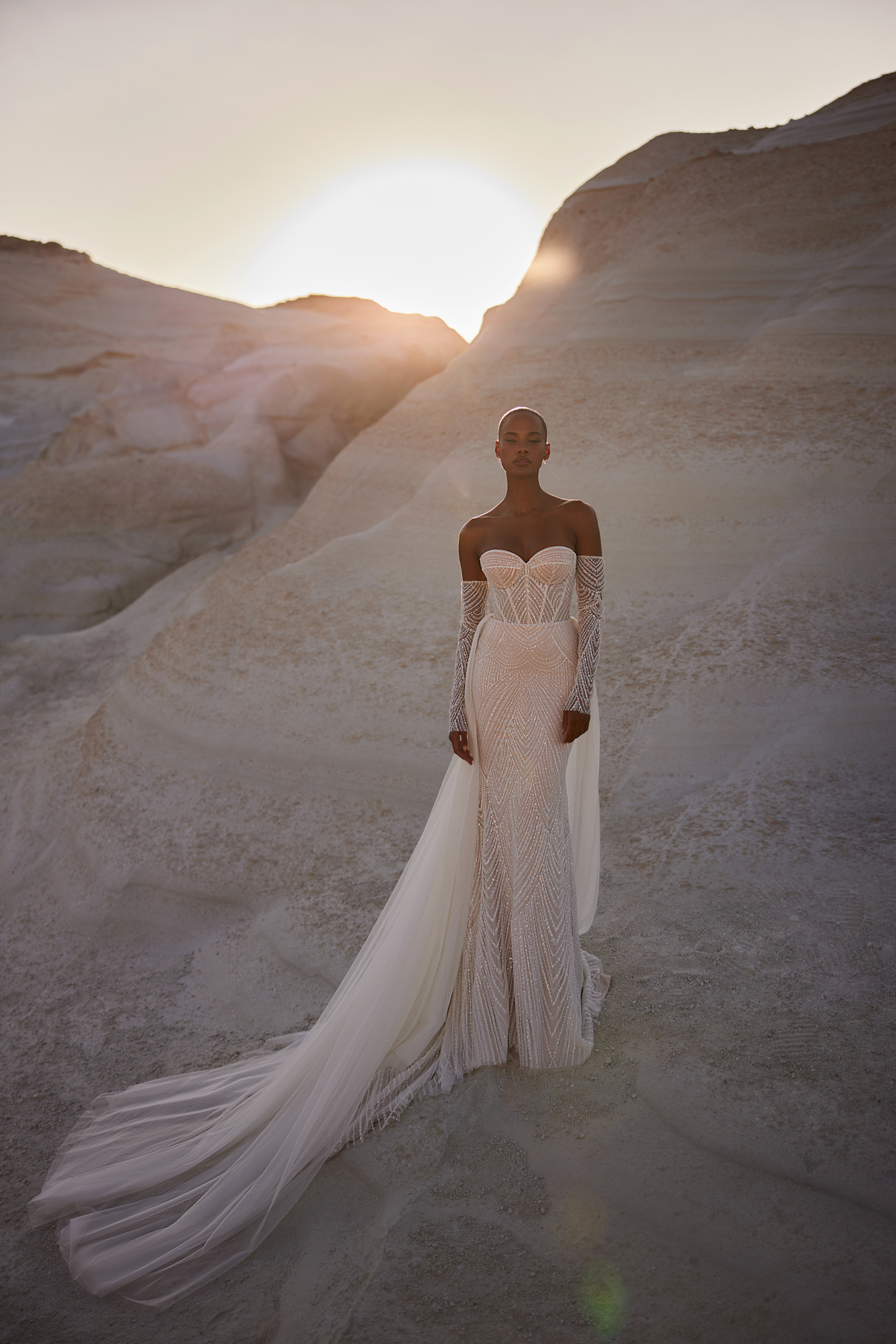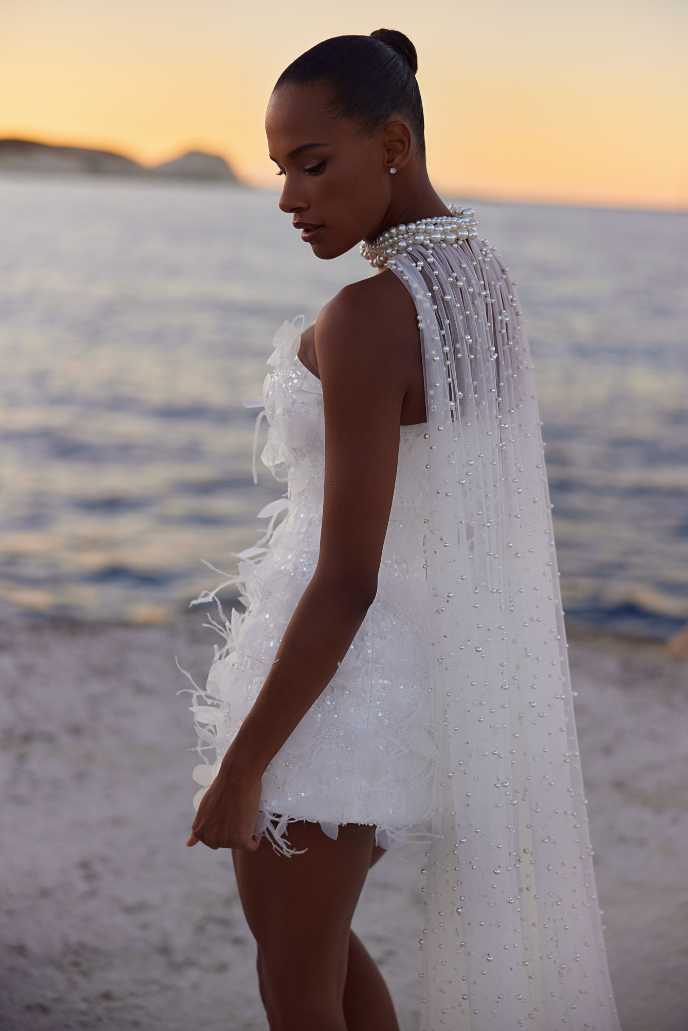 Paying homage to the modern bride, the collection encapsulates a refined union of softness and strength while enchanting onlookers with a bewitching synthesis of grace and determination. While the silhouettes remain timeless, they also possess a subtle daring quality, featuring playful minis and sophisticated splits that ensure each piece exudes effortless chicness and grace.