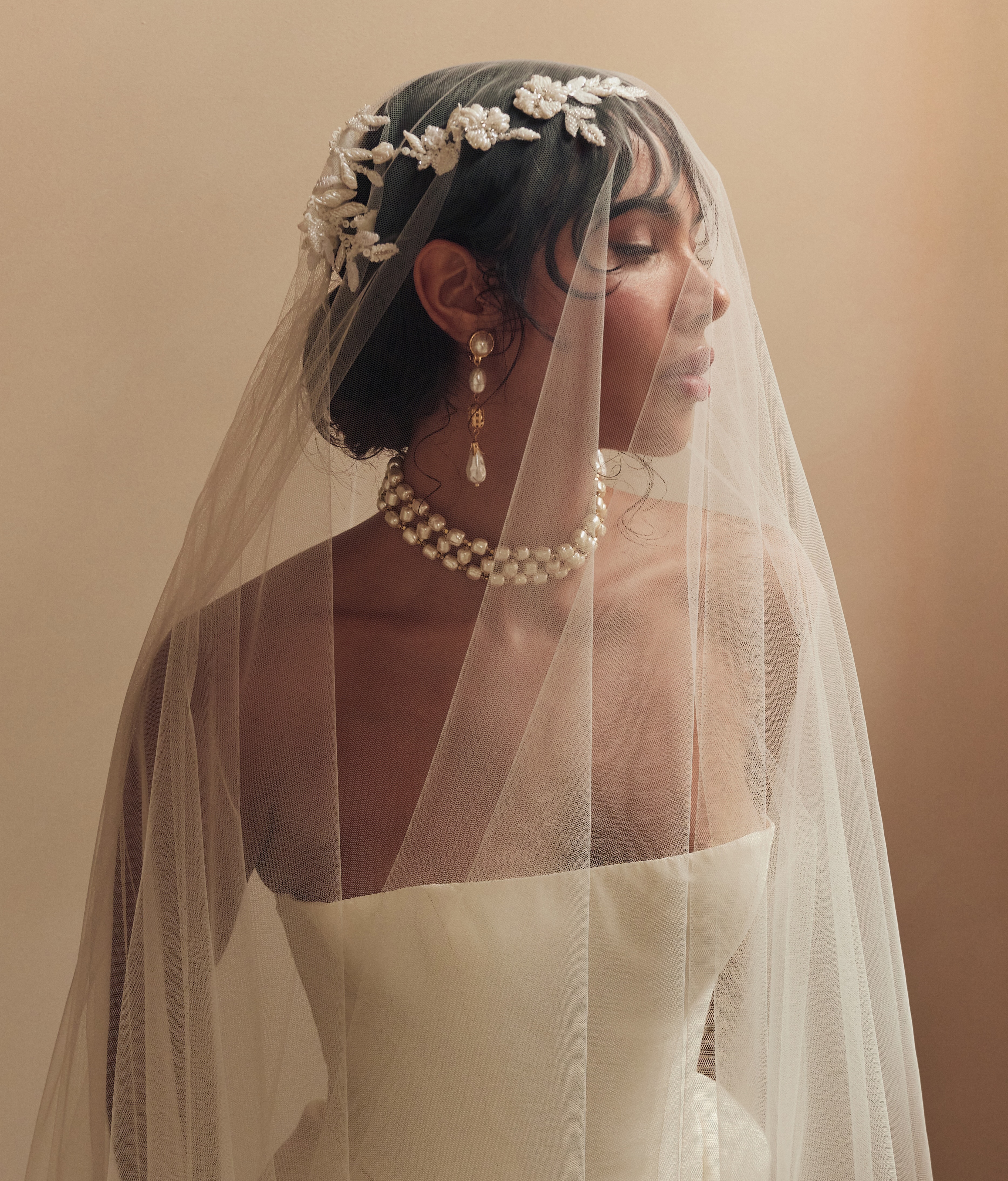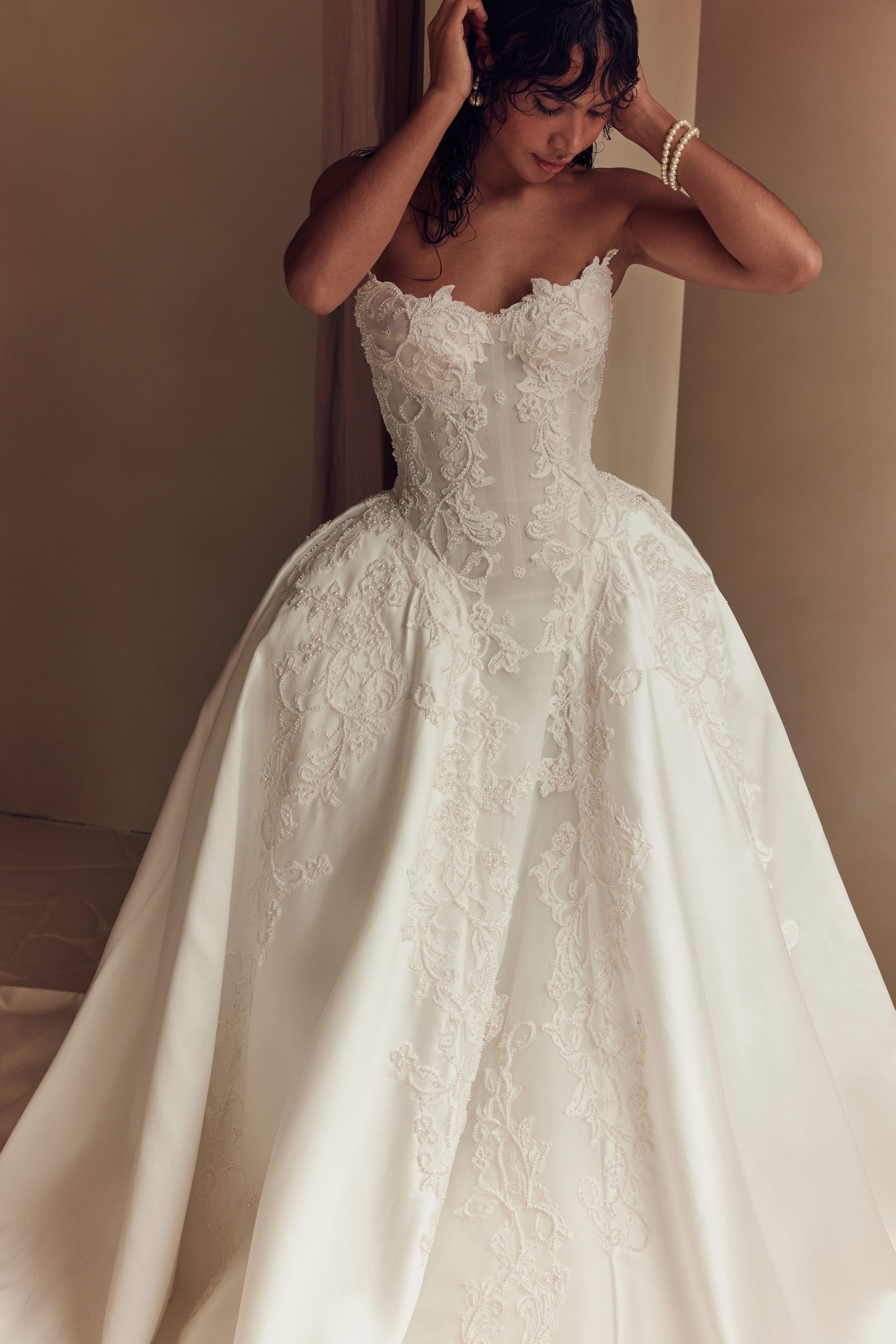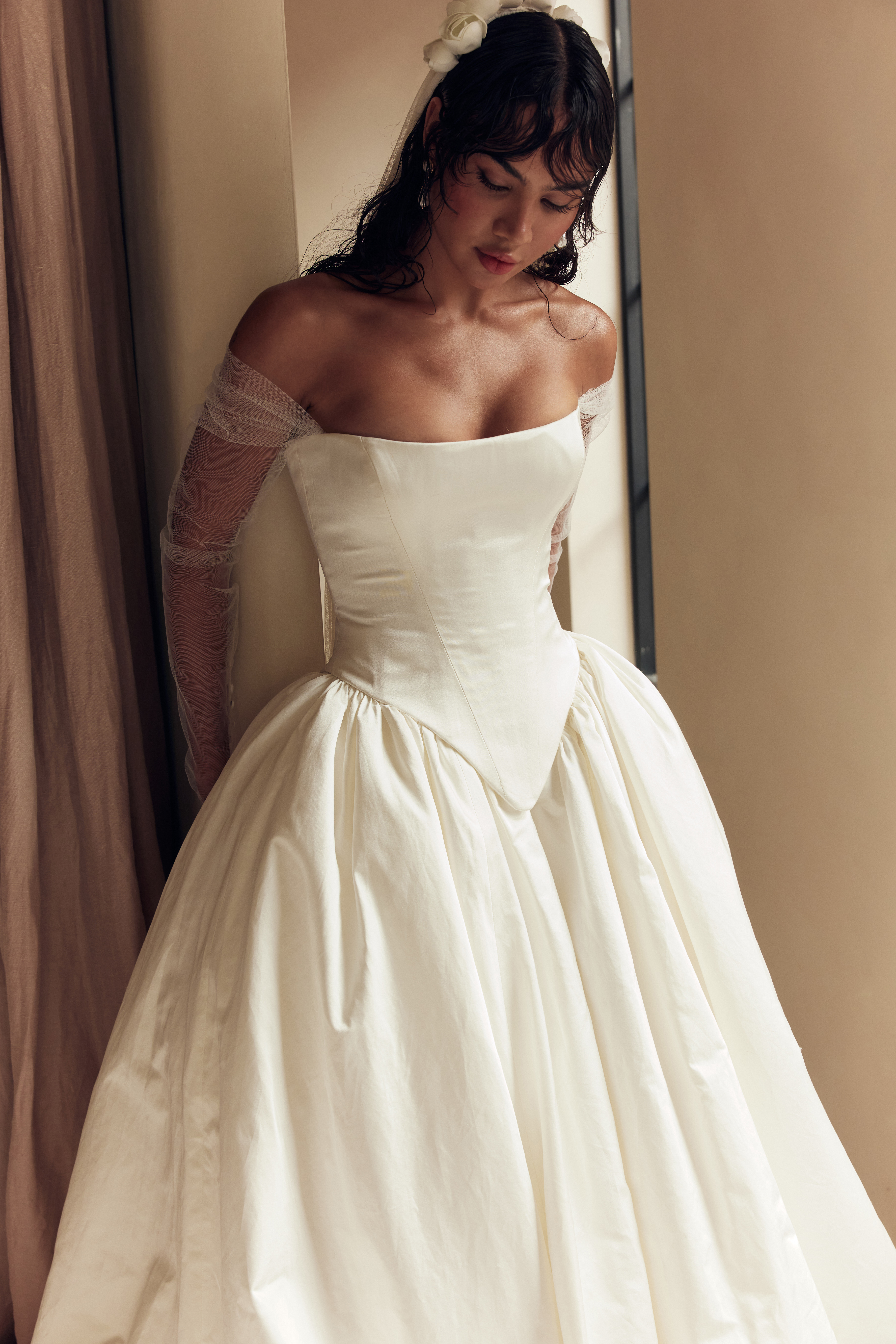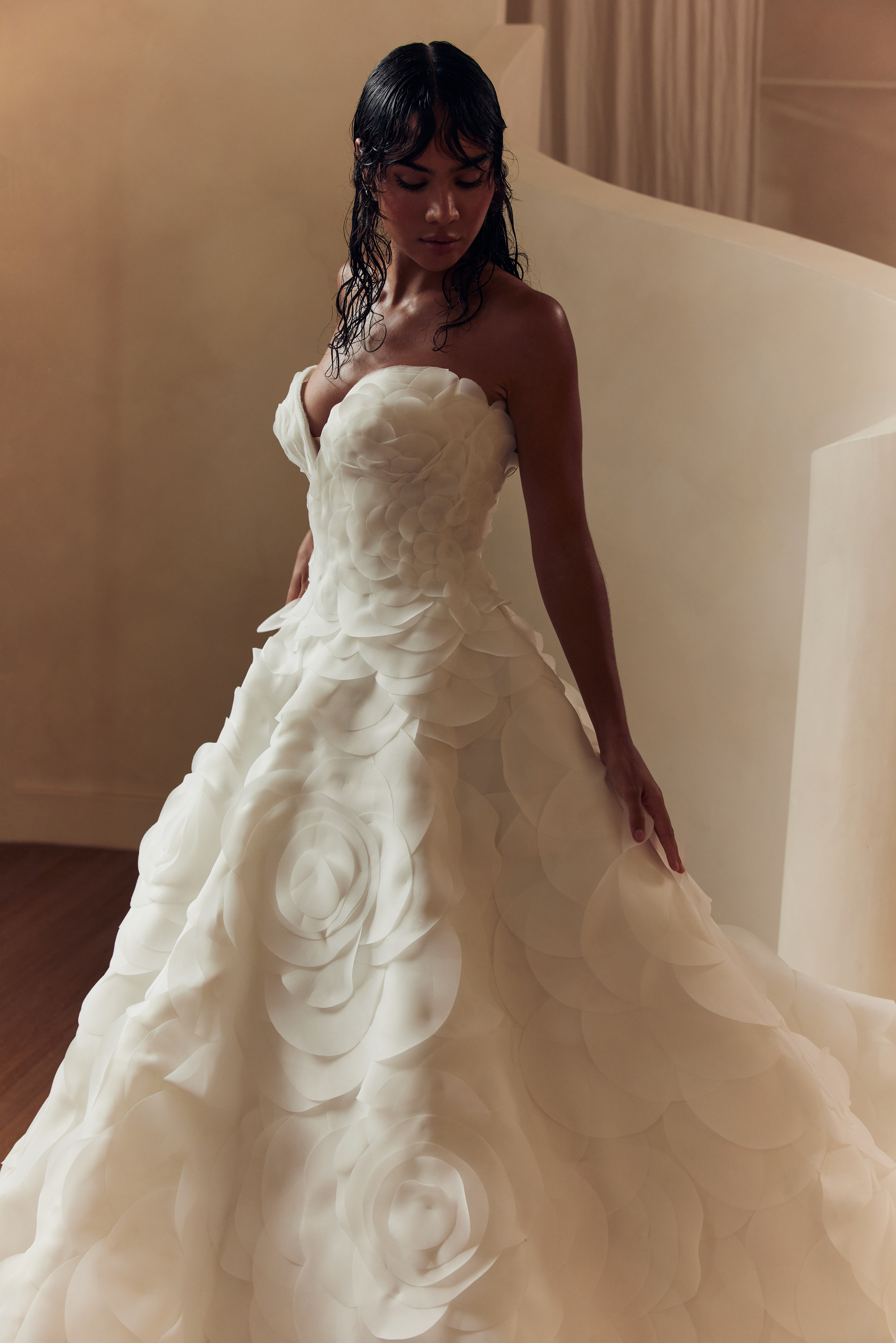 The fabric narrative underscores the collection’s duality: opulent silks, ethereal tulles, sculptural mikado, illusion mesh and sheer organza are artfully juxtaposed with moments of stark simplicity. The tactile richness of these materials engenders a dynamic dialogue between restraint and opulence.