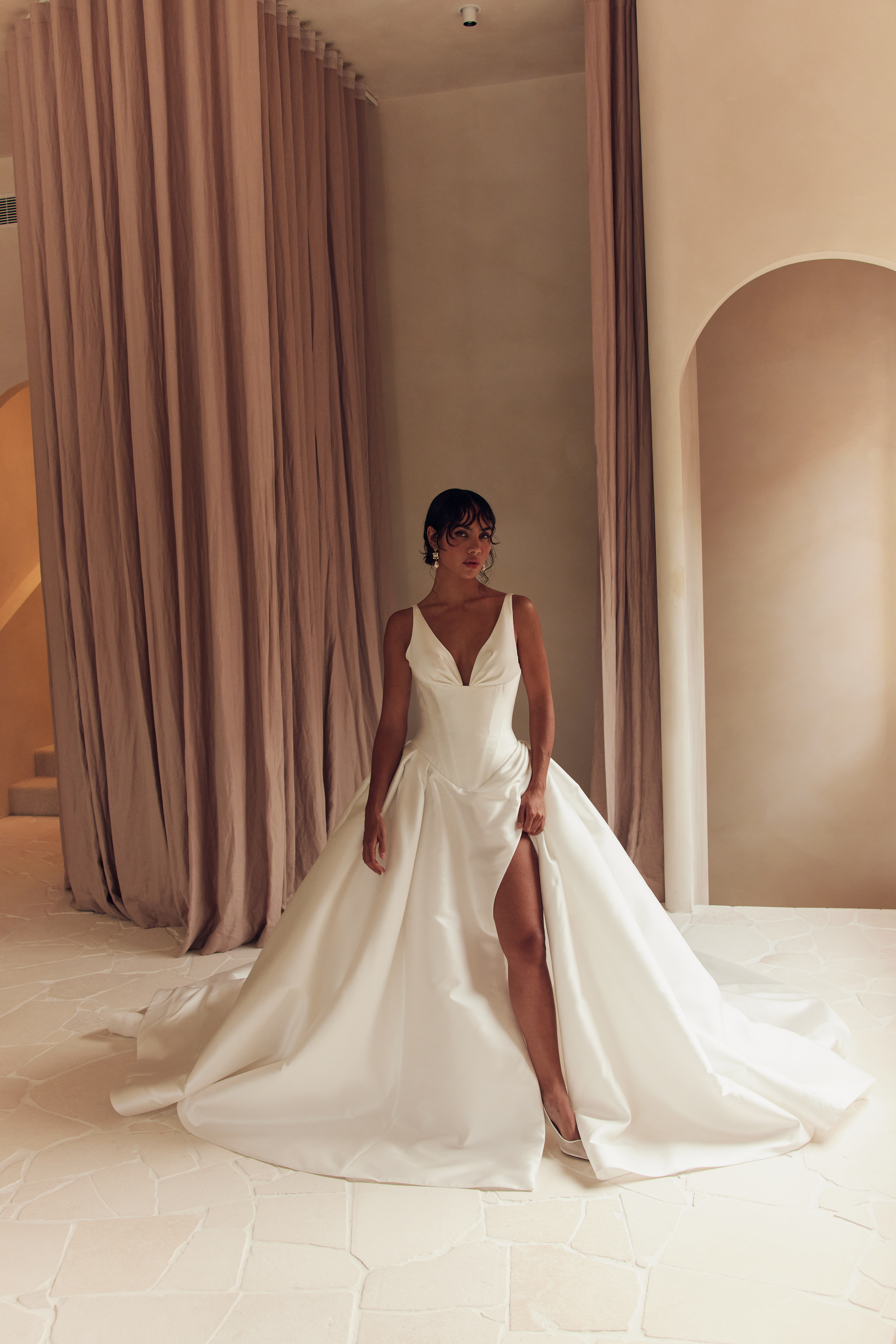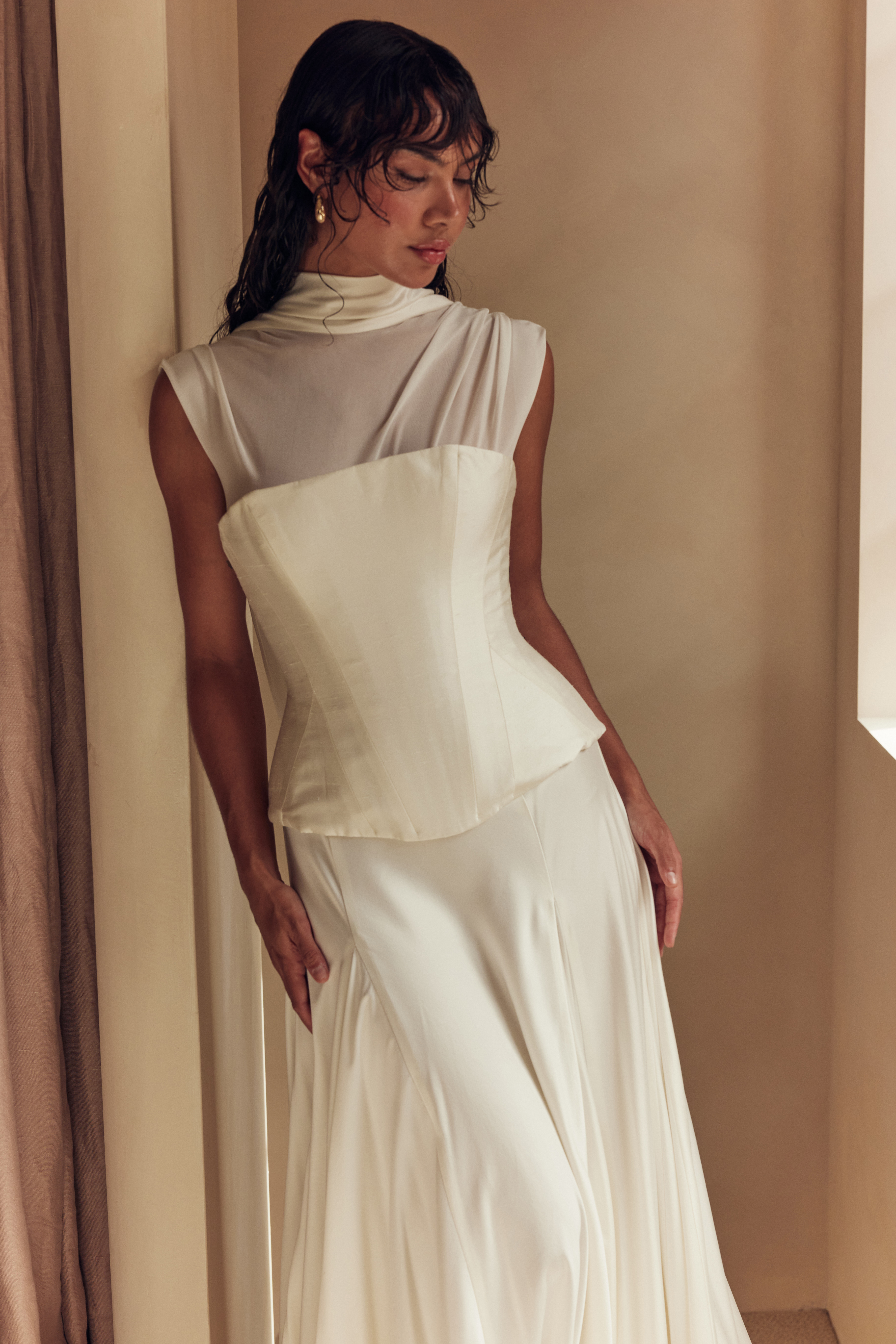 At the heart of the collection lies a profound engagement between structure and softness. The label’s signature basque waists sculpt and define the silhouette, engendering a sense of strength that celebrates the feminine form. Every curve, angle and seam is meticulously considered – an homage to Leah Da Glória’s unwavering commitment to elevating craftsmanship to art.