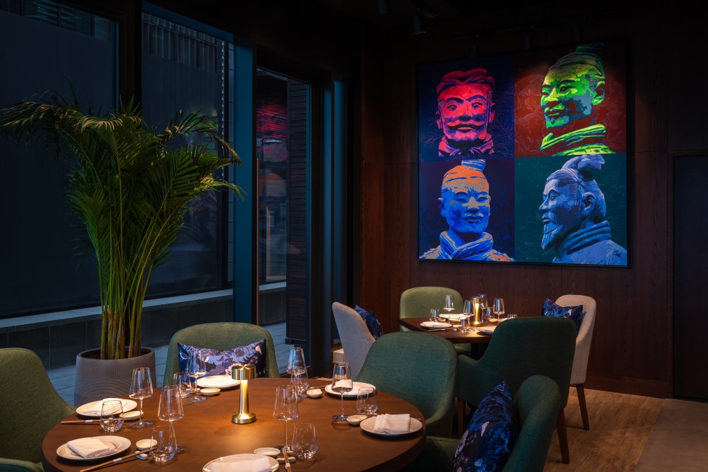The menu reads elegantly, without fuss. Chinese and Japanese influences sit side by side, confident and clearly defined. We begin with black cod with Jinlan sauce, crispy chicken with lime sauce, and the utterly divine charcoal tofu with wild mushrooms.