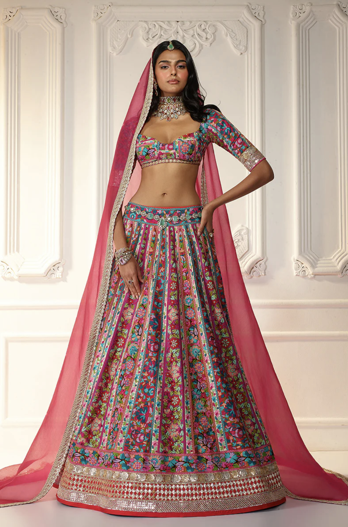 The Sangeet follows as a more energetic evening celebration. Traditionally, it features choreographed performances by friends and family, often rehearsed weeks in advance. The atmosphere is joyful and expressive, making it the perfect occasion to embrace bolder styling, statement jewellery and embellished fabrics.